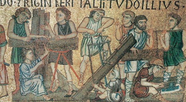 在圣马可教堂内,有一幅13世纪人们建筑方舟的马赛克壁画,生动地展示了造船技术。