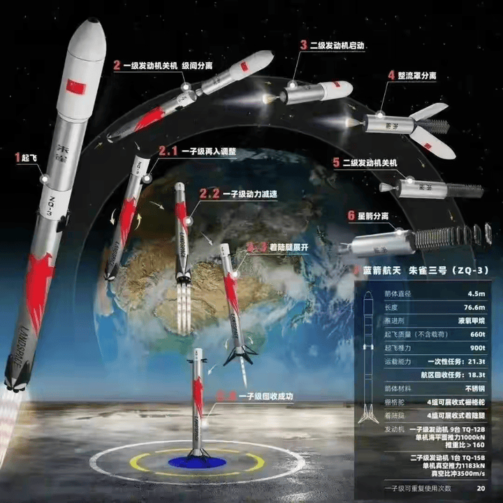 更关键的是,朱雀三号的“航区回收”设计(在发射场周边指定区域着陆),无需依赖海上回收平台,降低了回收难度与成本。其公司蓝箭航天透露,其回收成功率目标为“首飞即实现80%以上精度”,这要超过猎鹰9号首飞时的50%。