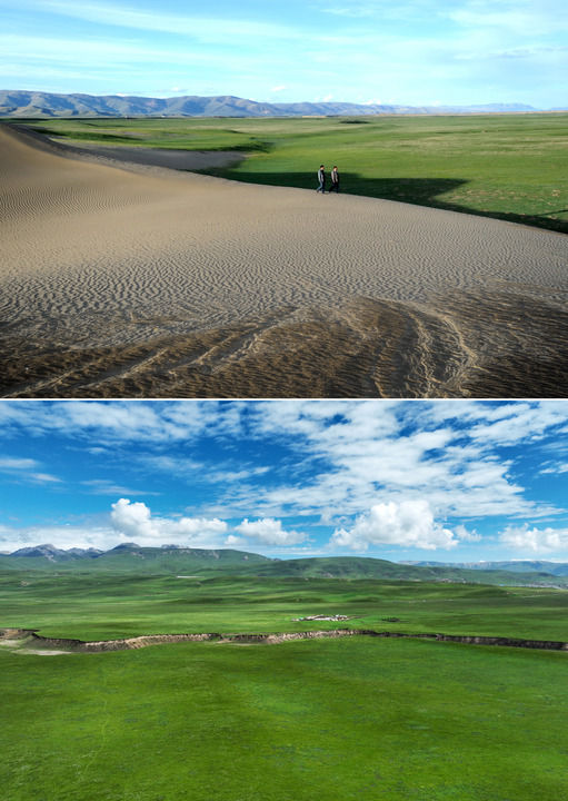 拼版照片:上图为2011年6月9日,两名技术人员在查看甘肃省甘南藏族自治州玛曲县欧强村的草场沙化退化情况,这里是当时玛曲草原沙化最为严重的草场之一(新华社记者聂建江摄);下图为2023年7月6日拍摄的甘南藏族自治州玛曲县欧强村境内经过治理修复的草原。新华社记者 陈斌 摄