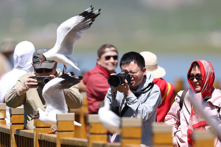 游客在甘肃省甘南藏族自治州碌曲县尕海湿地近距离拍摄、观赏棕头鸥(2025年7月11日摄)。新华社记者 陈斌 摄